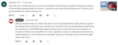 And, here's one from a Midnight 1978 who liked the video but would never run 6 psi. Because doing so would mean you would for sure roll a bead and 15-20 psi is all you would need to get out of the sand LOL